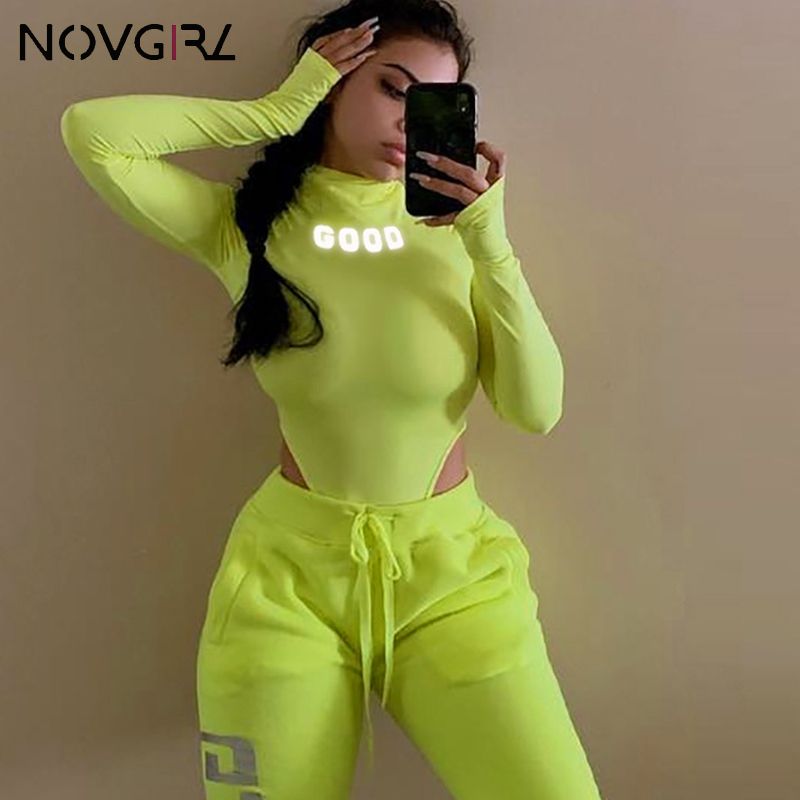 Reflective Letters Body Tops Women  neon green long sleeve bodysuit